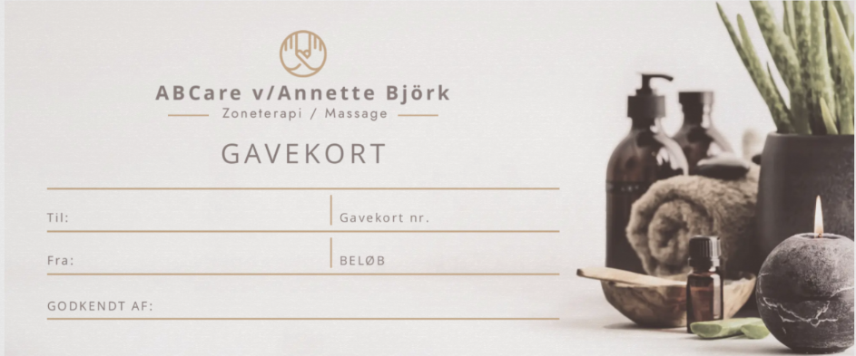 Gavekort bestilles på tlf. 6071 6058 eller på mail abcare.kontakt@gmail.com